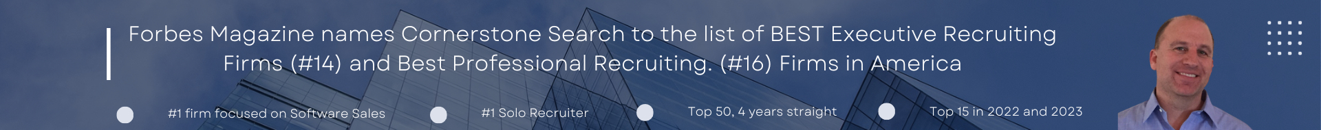 After paying his own expenses, buying the first computer in the company, and billing like a fiend, it was time to go out on his own. And that’s exactly what he did. He opened Cornerstone Search, switched verticals, and now almost 30 years later, he’s billed almost 20M in revenue, placed over 1000 senior professionals, and has been listed in the Forbes Top Fifty Recruiters for the last four years, most recently at #14. This makes him the highest ranked solo practitioner in our industry. He’s done this on his own, with just part-time administrative support.